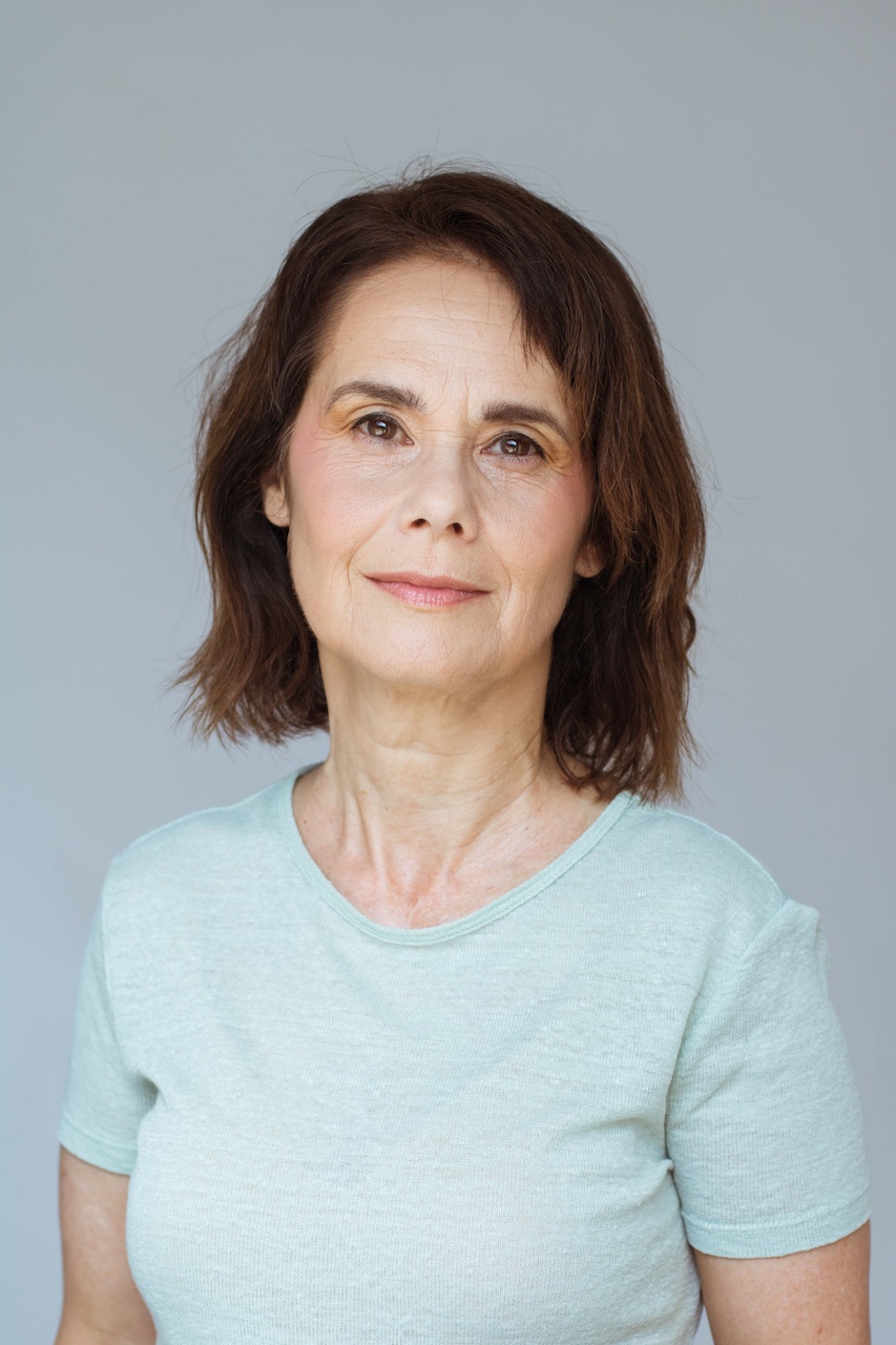 Primer plano de Emilia Cazorla con expresión serena y fondo neutro.